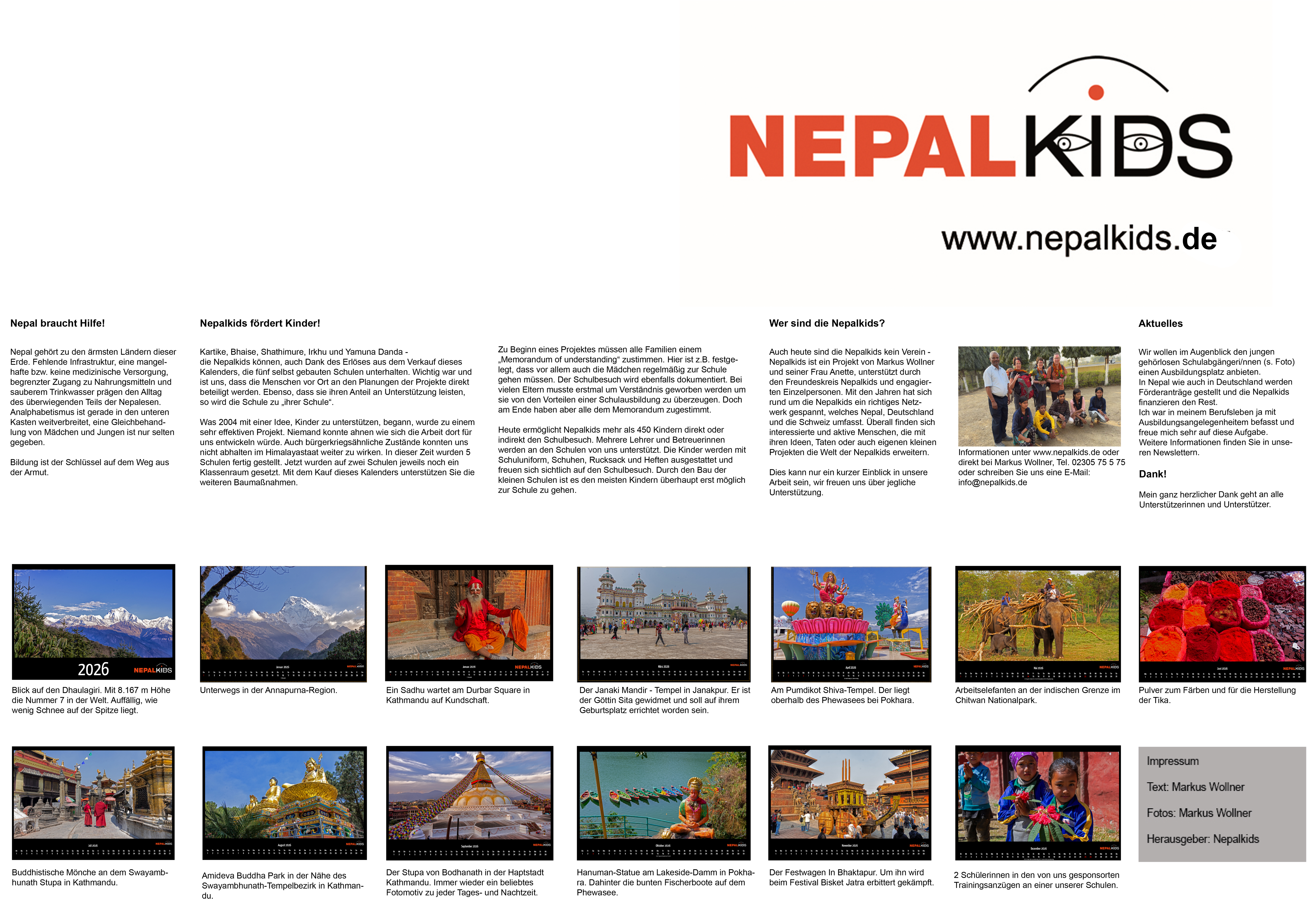 Ab sofort kann der klimaneutral gedruckte Kalender 2026 bestelt werden. Das Format ist wie immer DIN A2. Preis: 19,80 € + 6 € Versand. Einfach per eMail bestellen. Bestellt bitte hier. Oder E-Mail: kalender(at)nepalkids.de |